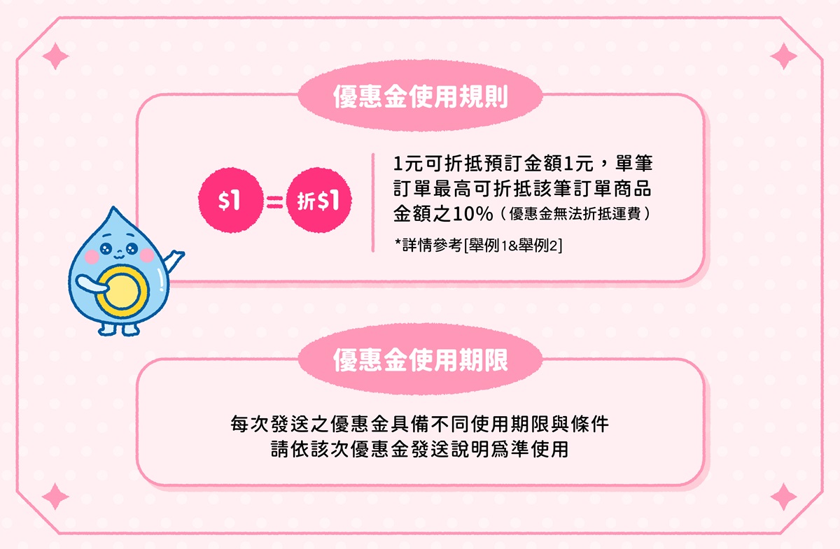 ※欲查詢累積優惠金可至 [會員中心] >> [優惠金] 查詢。 - 優惠金1元可折抵預訂金額1元,單筆訂單最高可折抵該筆訂單商品金額之10%(優惠金無法折抵運費)。