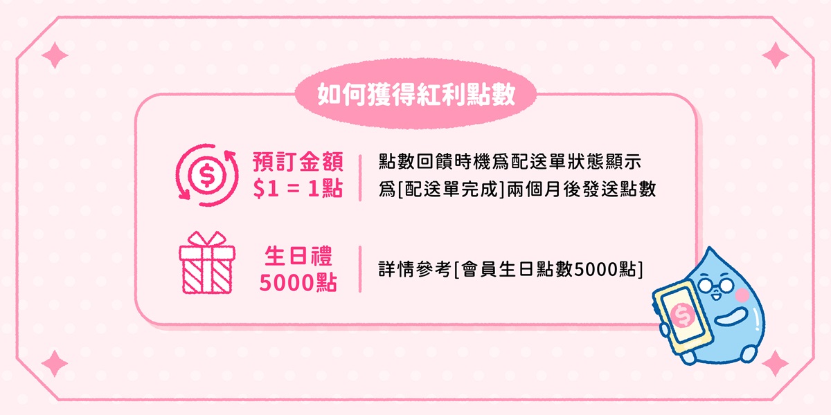 - 預訂金額1元=紅利點數1點,點數回饋時間為配送單狀態顯示為[配送單完成]兩個月後發送點數