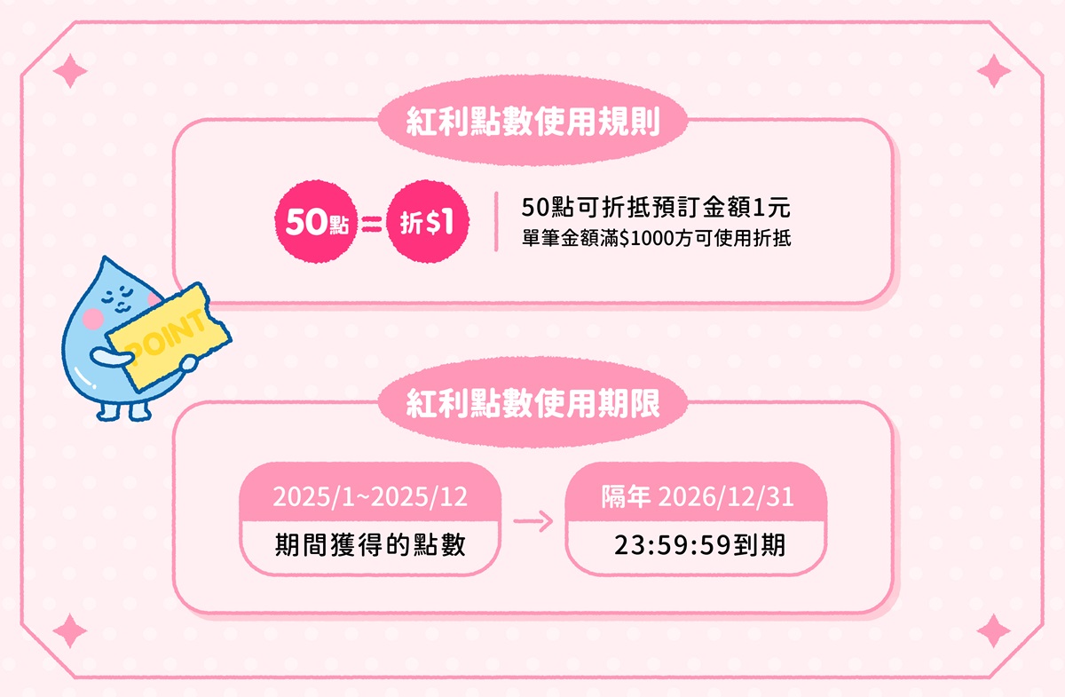 ※舉例→自2025年1月1日起至2025年12月31日止消費累積之點數,將於2026年12月31日到期失效 - 紅利點數於配送單折抵後,恕無法返還。