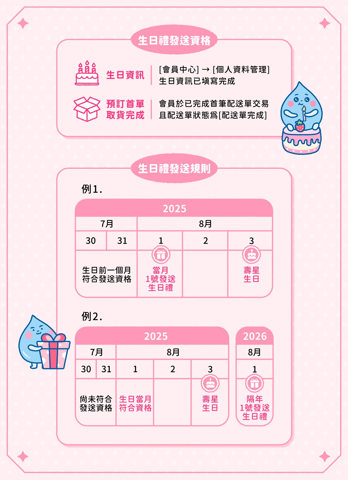 會員請務必自行事前確認[會員中心]>>[個人資料管理]生日資訊(輸入後不得再修改)已填寫完成,且會員於已完成首筆配送單交易(配送單狀態為「配送單完成」)後,始符合發放資格。 - 生日禮發送規則: