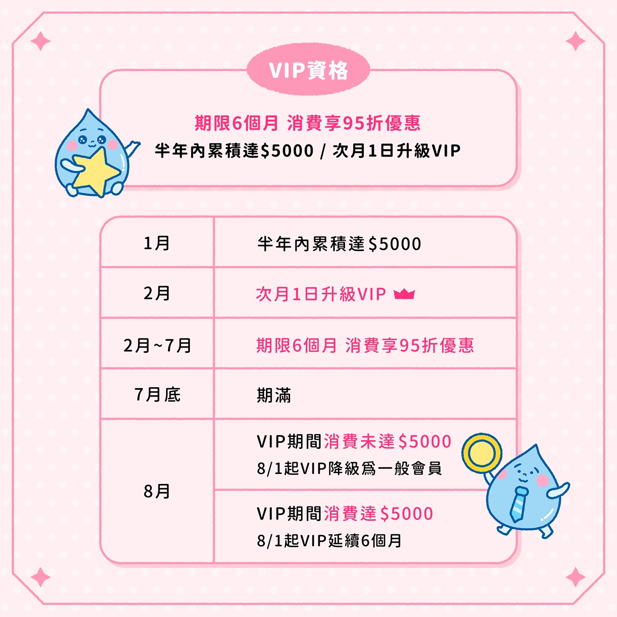 ※舉例:A小姐於5/15配送單完成後,累計達$5000門檻,將會於6/1成為VIP會員 - VIP會員時效為:半年,若VIP會員於半年效期內滿足累計預訂金額達$5000門檻,VIP會員資格將會自動延長半年
